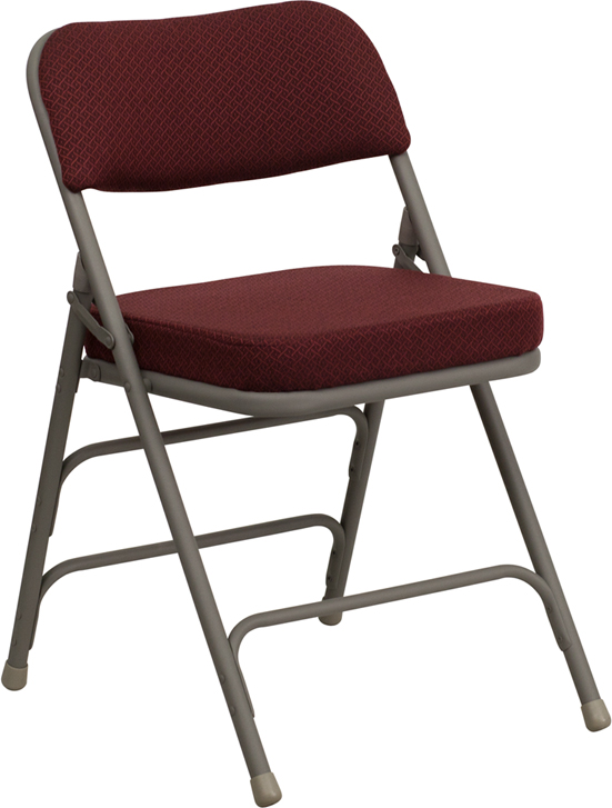 This chair is super comfortable featuring a 2 1/2 inch thick foam padded seat. The burgundy and beige look great together. Setup, and breakdown your meeting room at light-speed with this lightweight folding chair. The triple support braces support a max load of 300 lbs.