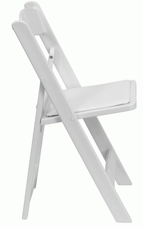 This white outdoor plastic resin chair is perfect for weddings, and other special events. This is the most common chair rental companies use for outdoor weddings. The old style of this chair consisted of a wood frame, and painted outside. This chair is constructed from commercial resin. The load rests on the cross beams, and not the holding screws. The 1/2" thick padded vinyl seat is removable, making it easy to clean.