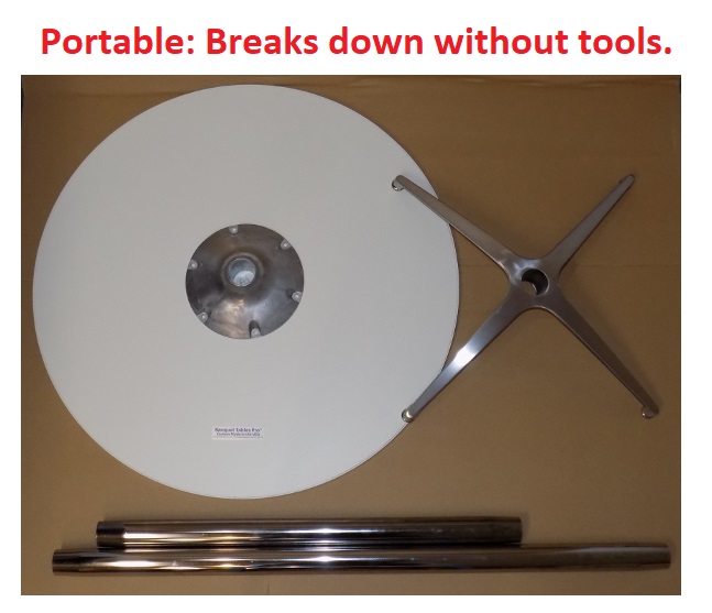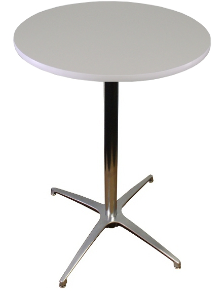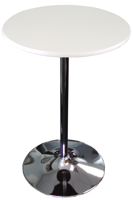 Made in the USA round knockdown cocktail table that features a white high-pressure laminate top & white vinyl t-mold. Tired of tabletop colors showing through your white table linen? This is the table for you! The laminate surface is water-resistant. Applications include trade shows, cocktail parties, or any other event you need an easy to set up & store cocktail table. The pole & base are both tapered, so all you have to do is slide them together to assemble & disassemble.