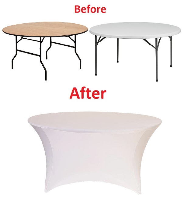 Banquet Tables Pro® 72 inch round stretch fit spandex table covers are designed to fit both plywood & plastic 72" (6 ft) round folding tables. The elastic foot pockets slip right over the feet of your table securing it in place.