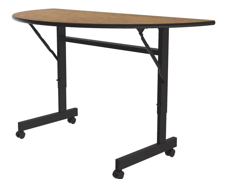 This half round flip top table features a melamine top with 2 color options. All color options have a black edge and frame. This table has an adjustable height, and wheels. Best of all, the top flips while not in use. This will allow you to quickly wheel all of your tables into your storage area.