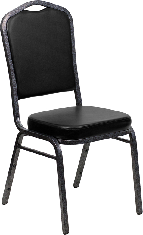 This sleek black vinyl stacking banquet style chair features a textured silver-vein frame, and crown back style. Designed for the most heavy duty applications, it's supported by a 16 gauge tubular steel frame.