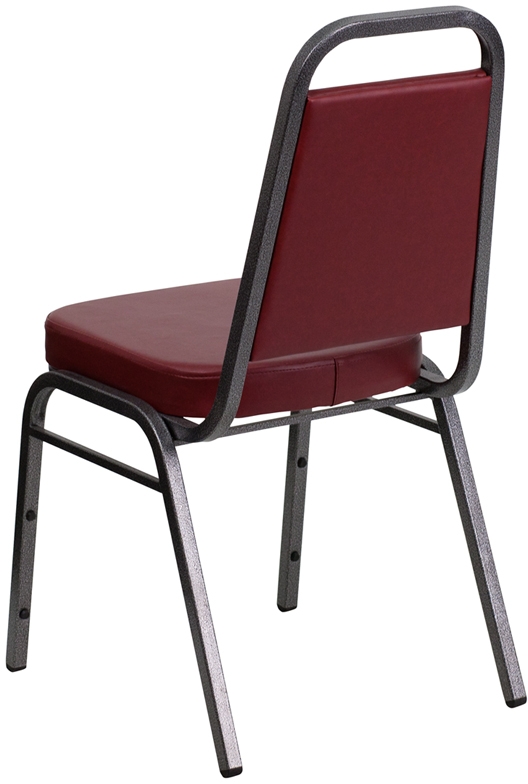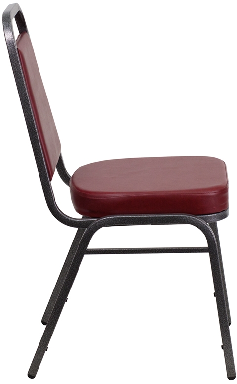 This chair features a durable burgundy vinyl seat and back, complimented with a silver-vein frame. This chair is very popular with pizza parlors. The burgundy matches a lot of the pizza color themes, while the vinyl is easy to clean. For restaurants, a popular combination with this chair is a black top table.