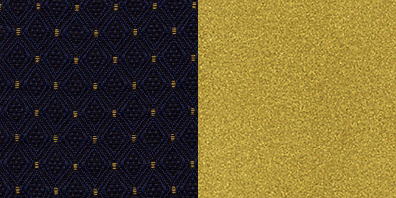 These banquet chairs feature a blue patterned fabric that has gold dots creating a diamond design. The gold dots are complimented by the textured gold frame.